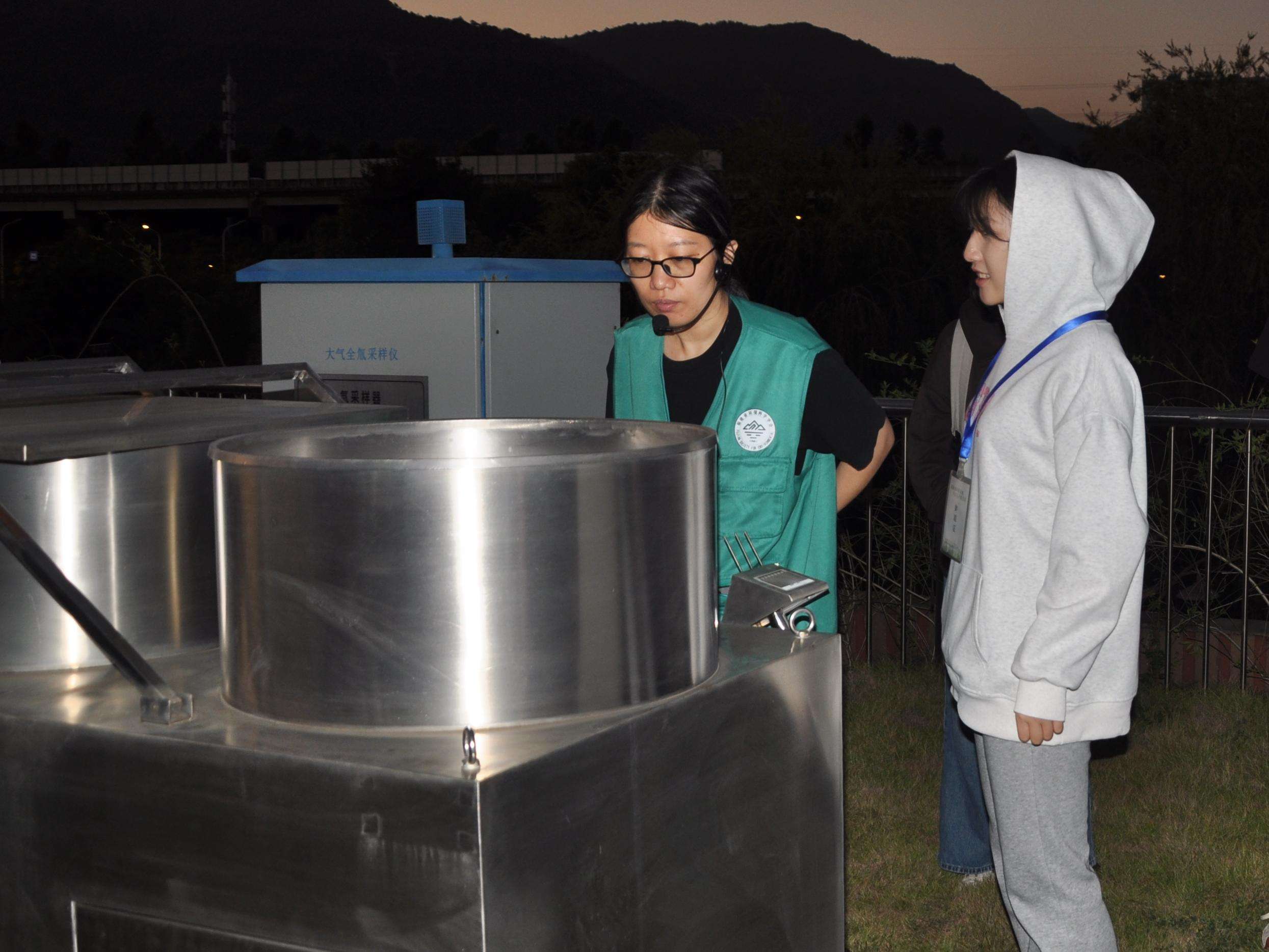 而后由工作人員帶領(lǐng)同學們前往基站站房平臺參觀采樣裝置,為同學介紹大流量氣溶膠采樣器及碘化鈉能譜儀的工作原理,并將干濕雨水采樣器作為介紹重點進行實際操作展示。整個科普教育環(huán)節(jié)內(nèi)容充實、氛圍活躍,同學們收獲頗豐。