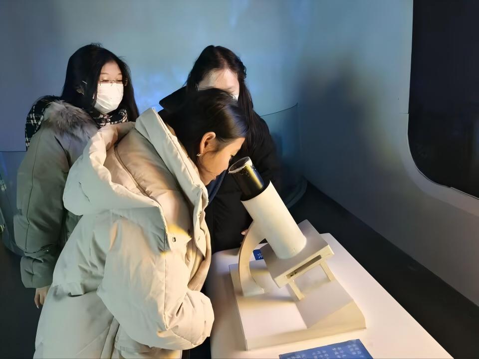 在實踐過程中,實踐隊員細致觀察顯微鏡下的海帶孢子有性繁殖的動畫影像。通過顯微鏡,實踐隊員可以看到海帶從一個小小的孢子,逐漸分裂成團狀的細胞團。“其實海帶并不一直是植物的,他是從動物變成植物的,即從微生物變成海藻”,工作人員講解到,“我們中國的海帶育苗技術(shù)非常先進,因為我們對海帶的生長非常了解,這也使我們變成了全球的海帶第一養(yǎng)殖大國。”認真學(xué)習(xí)相關(guān)信息后,實踐隊員對這一動畫影像有了更加深刻的理解。