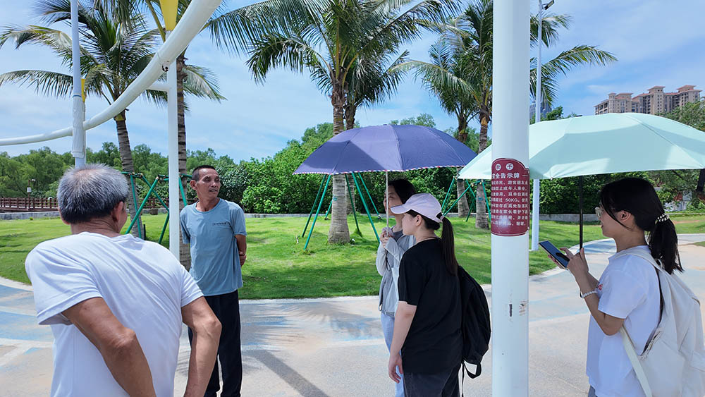 圖三圖四 隊(duì)員們向當(dāng)?shù)厝藗兞私饧t樹林種養(yǎng)耦合實(shí)驗(yàn)基地