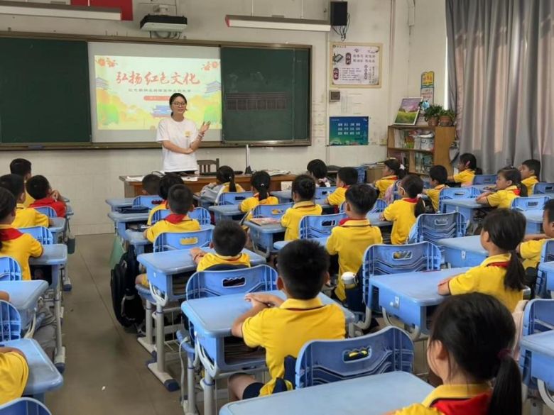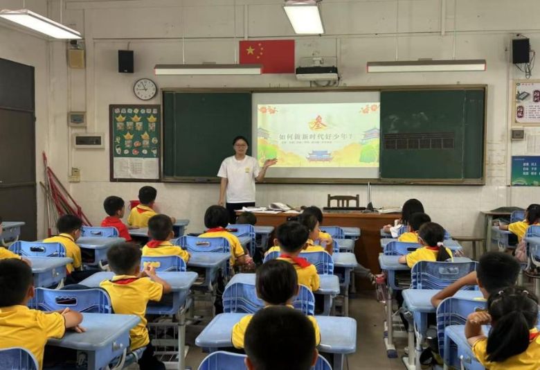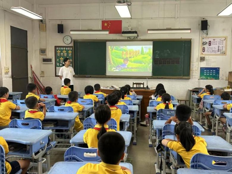 團隊成員課堂上手持紅領巾實物,以“為什么紅領巾是紅色?”“國旗上的星星代表什么?”等互動問題點燃課堂,孩子們爭相舉手,爭相回答團隊成員提出的問題。
