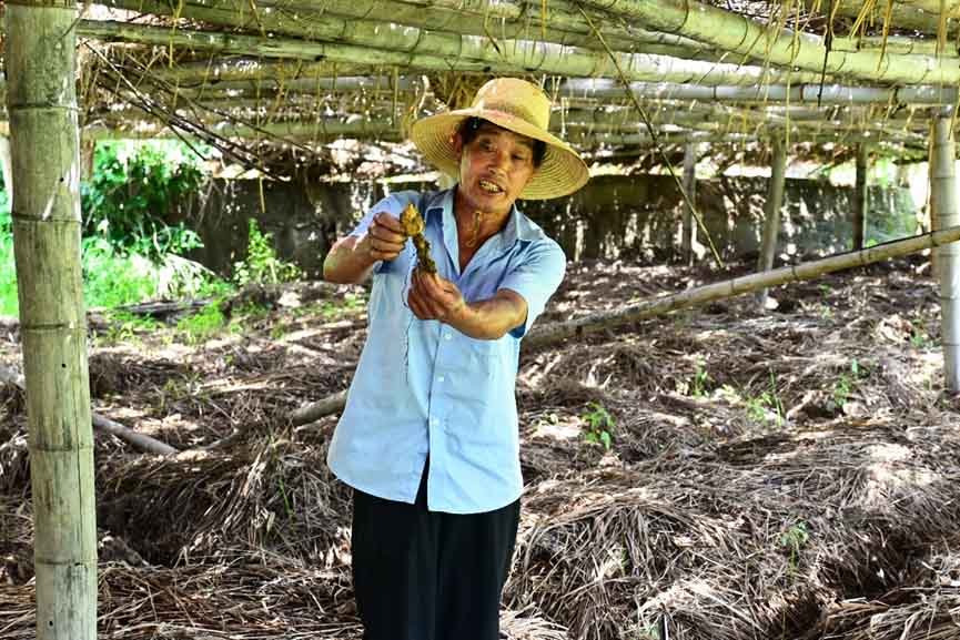 沿著蜿蜒的田間小道,團(tuán)隊(duì)走進(jìn)連片的天麻種植基地。遮陽(yáng)網(wǎng)下,腐殖土覆蓋的菌床整齊排列,濕潤(rùn)的空氣里彌漫著草本植物的清香。當(dāng)?shù)卮迕翊笫瀣F(xiàn)場(chǎng)演示天麻采挖過(guò)程:“天麻靠蜜環(huán)菌提供養(yǎng)分,挖的時(shí)候要順著菌索找,不能傷了菌絲。”隨著覆土輕輕撥開(kāi),一顆紡錘形的新鮮天麻露出褐色表皮,肉質(zhì)飽滿的塊莖上還附著濕潤(rùn)的泥土。