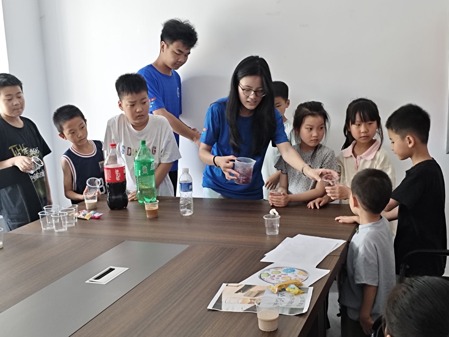 活動伊始,實踐團(tuán)成員通過精心設(shè)計的"水的較量"對比實驗,將等量自來水與純凈水置于實驗器皿中,用肉眼可見的水質(zhì)變化生動展現(xiàn)細(xì)菌的隱匿性,瞬間點燃孩子們的求知熱情。隨后,志愿者們化身"科學(xué)魔法師",帶領(lǐng)孩子們探索牛奶與可樂混合產(chǎn)生絮狀物、紫甘藍(lán)汁液遇酸堿變色等奇妙現(xiàn)象,以趣味實驗為載體,深入淺出地講解食品中的科學(xué)原理。