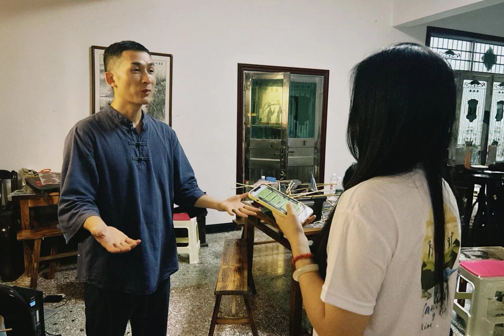 作為紙影戲影偶制作技藝省級(jí)非遺傳承人、市民間文藝家協(xié)會(huì)主席,吳淵老師自幼跟隨吳升平爺爺學(xué)習(xí)紙影文化。雕刻、制作已經(jīng)成為他生活的一部分。在談及爺爺寫(xiě)信要他回來(lái)時(shí),吳老師的表情一改之前的平靜,鼻頭發(fā)紅,眼睛也微微濕潤(rùn)。因?yàn)閰菧Y老師從小受爺爺影響,所生活的環(huán)境都是看爺爺在舞臺(tái)上敲鑼打鼓,表演紙影戲。當(dāng)他在紙影和工作之間糾結(jié)時(shí),爺爺直接表態(tài)他來(lái)兜底,這讓他有了信心和力量。所以他最終決定辭職返鄉(xiāng)。