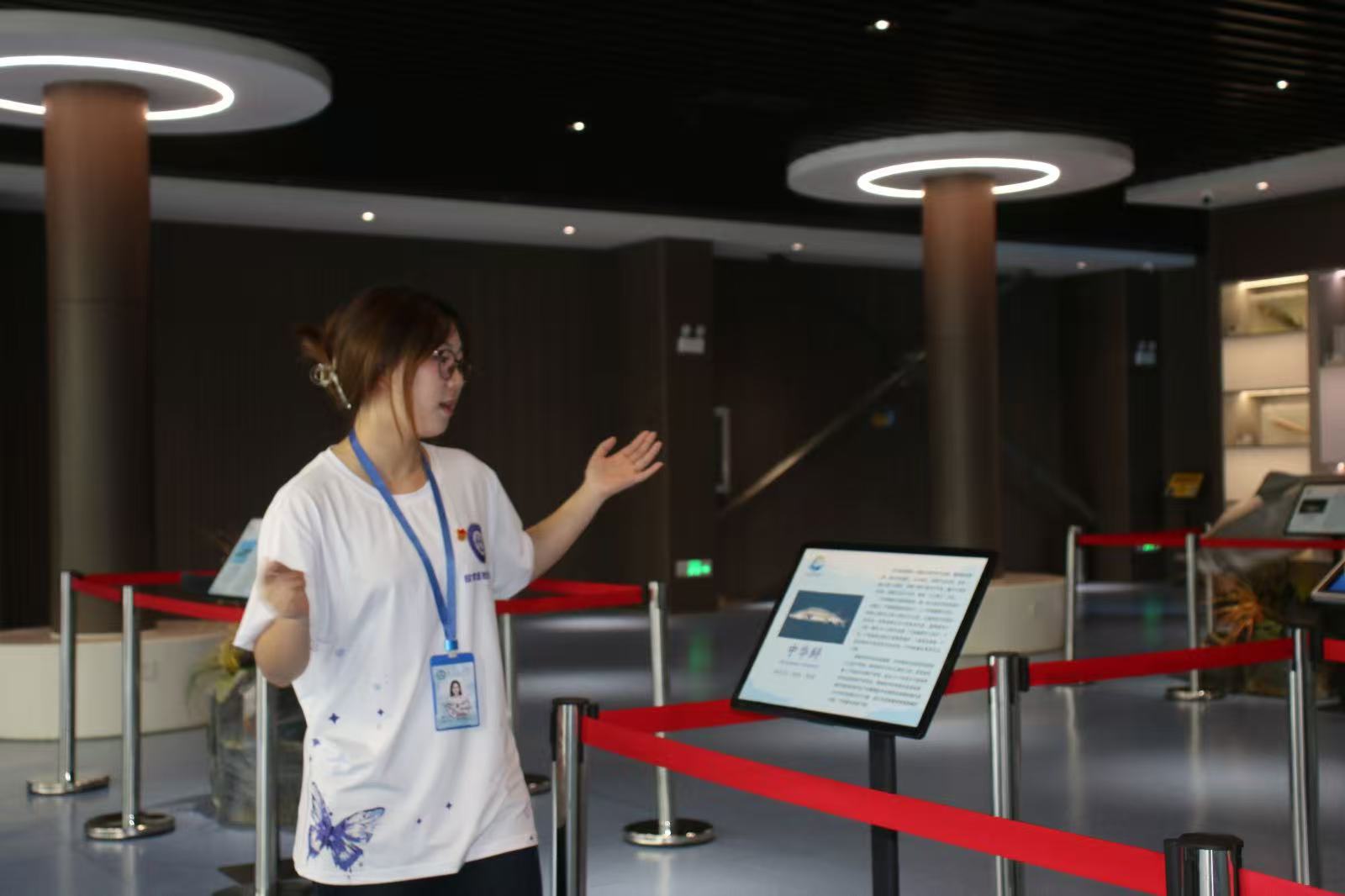 調(diào)研首日,團隊來到中華鱘保護區(qū)科普展覽館,在講解員的帶領(lǐng)下,近距離觀察了不同生長階段的中華鱘活體及其標本。中華鱘作為長江旗艦物種,已有1.4億年演化歷史,但因過度捕撈、棲息地破壞等因素,野生種群數(shù)量急劇下降,被列為國家一級保護動物。團隊成員通過圖文展板、多媒體影像和實物模型,系統(tǒng)學習了中華鱘的生活習性、洄游特征及瀕危原因,并重點記錄了保護區(qū)采取的人工繁殖、科學放流、棲息地修復(fù)等保護措施。