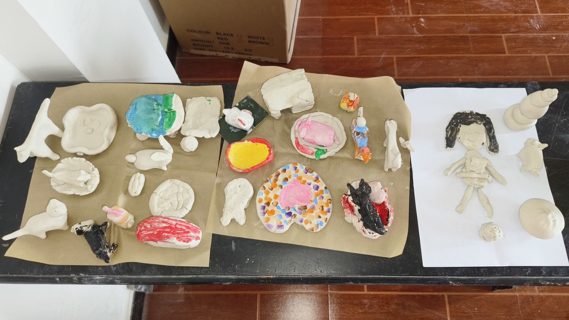 當(dāng)空蕩蕩的教室逐漸被孩子們的歡聲笑語充滿,開課典禮即將迎來序幕,看這些可愛又陌生的面孔,成員們又一次的感到支教責(zé)任的重量。握拳,舉手,開掌,孩子們創(chuàng)造出屬于自己的煙花:開班典禮的第一個(gè)簡(jiǎn)單的儀式,使孩子們對(duì)課堂的小小期待生根發(fā)芽。在成員們熱情洋溢的自我介紹之后,支教的第一節(jié)課悄然開始。為了吸引孩子們的對(duì)課程興趣,團(tuán)隊(duì)選取了泥塑手工課作為開班第一課,以“我的夢(mèng)想形象”作為主題,孩子們天馬行空的想象,添上成員們耐心指導(dǎo)的翅膀,化為一件件獨(dú)一無二、栩栩如生的泥塑作品,將夢(mèng)想編入現(xiàn)實(shí),在創(chuàng)作中收獲喜悅。