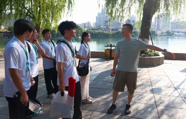 圖為張玉濤助理帶領(lǐng)志愿隊參觀鏡湖環(huán)境 盧冠文 供圖
