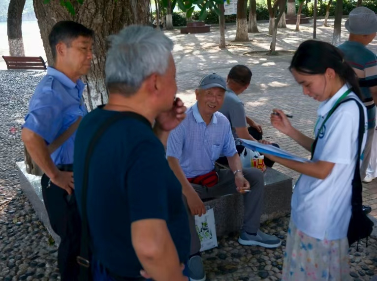 隨后,志愿隊穿梭于社區(qū)街巷,與不同年齡、職業(yè)的居民展開深入交流。“您了解‘長江大保護’政策嗎?通過哪些渠道知曉的?”“您覺得鏡湖的水環(huán)境發(fā)生了哪些變化?”面對這些問題,居民們真誠回應(yīng)。有人通過電視新聞、社區(qū)宣傳欄知曉政策,卻期待更深入的解讀;有人欣喜于湖水日益清澈,也對潛在的污染風(fēng)險心存憂慮;還有人積極建言,希望加強環(huán)境監(jiān)管、完善公共設(shè)施。每一句樸實的話語,都承載著居民對家園的深情與期許。