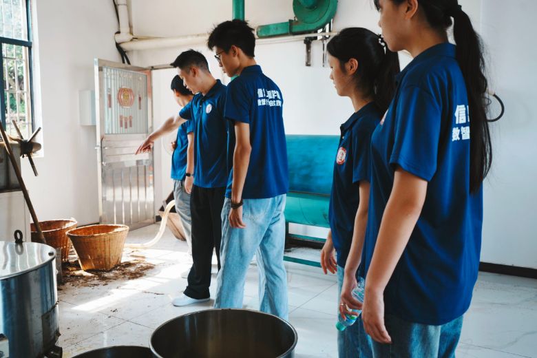 步入榨油坊,濃郁的菜籽香撲面而來(lái),現(xiàn)代榨油機(jī)透著高效精準(zhǔn)的工業(yè)氣息,承載著當(dāng)?shù)卣ビ彤a(chǎn)業(yè)的沉淀。在彭剛老師引導(dǎo)下,隊(duì)員們圍在一旁,認(rèn)真聆聽(tīng)“炒籽、碾粉、蒸胚、包餅、榨油”等工序的講解。當(dāng)金黃的菜籽油從榨油機(jī)中緩緩流出,現(xiàn)代工藝的高效與匠人的堅(jiān)守令隊(duì)員們深受震撼。大家隨即用鏡頭、筆記記錄下工藝流程,彭剛老師則適時(shí)啟發(fā)思考:“如何用大數(shù)據(jù)、物聯(lián)網(wǎng)實(shí)現(xiàn)生產(chǎn)智能監(jiān)控?怎樣借電商平臺(tái)拓展‘老味道’市場(chǎng)?”在這樣的互動(dòng)中,現(xiàn)代技藝與數(shù)字技術(shù)的融合方案初步形成。