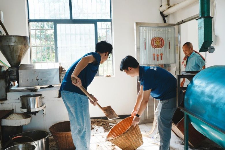 隨后,隊(duì)員們積極參與到榨油坊的實(shí)際操作中。隊(duì)員徐嘉俊和董瑞佳主動(dòng)上前,幫助老師傅清理油渣。油渣清理看似簡(jiǎn)單,實(shí)則需要耐心與細(xì)致,既要徹底清除殘留的油渣以保證設(shè)備后續(xù)運(yùn)行順暢,又要避免清理過(guò)程中對(duì)設(shè)備造成損壞。兩人在老師傅的指導(dǎo)下,小心翼翼地操作著,不一會(huì)兒額頭便滲出了汗珠,但他們絲毫沒(méi)有懈怠,始終專(zhuān)注于手中的工作。這一過(guò)程讓他們真切感受到了榨油工作的繁瑣與不易,也對(duì)老師傅日復(fù)一日的堅(jiān)守更加敬佩。
