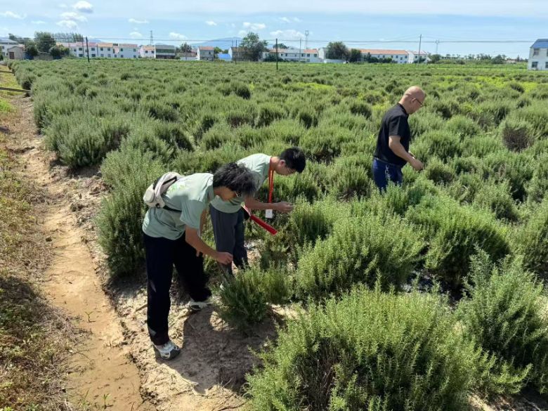 在踏入種植基地后,陣陣清香撲面而來。田師傅詳細(xì)講解迷迭香喜陽耐旱的生長習(xí)性與“一次栽種多年采收”的種植優(yōu)勢,并結(jié)合當(dāng)?shù)厣百|(zhì)土壤條件,揭秘高產(chǎn)種植秘訣。