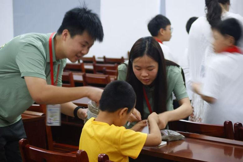 不僅如此,志愿服務(wù)隊(duì)還心系當(dāng)?shù)亓羰貎和Mㄟ^在迷迭香基地采集并加工的迷迭香,與仙雨砦村的留守兒童共同制作香囊。在這個過程中,隊(duì)員們和孩子們歡聲笑語不斷,不僅鍛煉了孩子們的動手能力,也讓他們感受到了關(guān)愛與陪伴。當(dāng)孩子們手上拿著散發(fā)著淡淡香氣的香囊,純真的笑容綻放在臉上,這份溫暖與關(guān)愛,也成為此次三下鄉(xiāng)活動中最美的風(fēng)景。