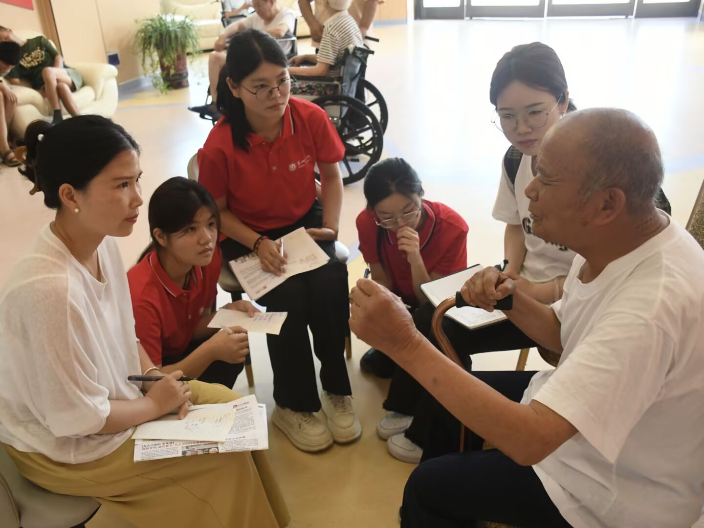 隊員們通過傾聽老黨員的經(jīng)歷,感悟頗多,其中黨員李鴛鴦表示他們身上能夠明顯的感受到偉大往往藏在平凡里,他們沒有驚天動地的事跡,只有"黨需要就去干"的樸素信念。正是千千萬萬這樣默默奉獻(xiàn)的普通人,用一生的堅守鑄就了今天的中國。采訪結(jié)束后,隊員們推老人們下樓看電視,引導(dǎo)老人開展套圈、投壺等娛樂活動、陪伴老人聊天,通過志愿行動踐行“尊老敬老”的中華傳統(tǒng)美德。