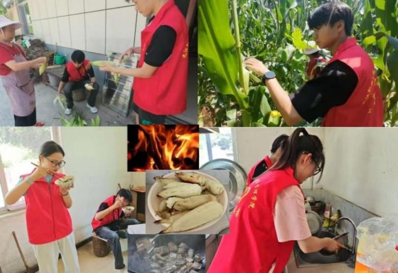 午間在廚房忙碌,在護(hù)工阿姨的指導(dǎo)下,隊員們從擇菜、洗菜到切配一系列動作雖生澀卻專注。灶膛里柴火噼啪作響,火苗映紅臉龐,炊煙裊裊升起。玉米掰開時“咔嚓”脆響,魚切塊時刀刃與砧板碰撞,都成了廚房交響樂。當(dāng)香氣四溢的蒸玉米、煎魚與軟糯米飯端上桌,朱奶奶顫顫巍巍地接過碗,眼中滿是對隊員們的贊許。這一頓午餐,不僅僅是食物的味道,更是愛的傳遞和延續(xù)。