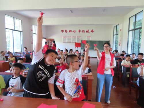 短暫的課間休息之后,老師們分發(fā)進(jìn)行手工課折紙的材料和工具,課上,同學(xué)們跟隨著老師耐心的步驟演示和指導(dǎo),學(xué)習(xí)了三種愛(ài)心的不同折法。老師的教學(xué)別出心裁層層遞進(jìn),從“平面”愛(ài)心到“立體”愛(ài)心,孩子們的心靈也隨著愛(ài)心的豐滿(mǎn)而升華,支教的意義仿佛在此刻具象化。除此之外,一些心靈手巧的學(xué)生還扮演起了“老師”的角色,教身邊同學(xué)其他物品的折法,整個(gè)課堂的氛圍被同學(xué)們精美作品所點(diǎn)燃。孩子們舉著自己的作品互相展示,笑聲混著紙張翻動(dòng)的沙沙聲,整個(gè)教室變成了歡樂(lè)的海洋。