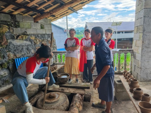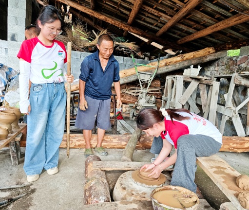 活動(dòng)中,實(shí)踐團(tuán)拜訪了湘西州州級(jí)第四代非遺土陶傳承人彭繼松,深入了解湘西傳統(tǒng)土陶制作工藝及其背后的文化內(nèi)涵。彭爺爺詳細(xì)介紹了陶藝的悠久歷史、發(fā)展脈絡(luò)、土陶制作的全過程,并分享了自己堅(jiān)守土陶技藝的心路歷程。他指出:他的土陶主要采用當(dāng)?shù)刎S富的金剛泥,土陶制作需經(jīng)過捏制、雕刻、曬干和高溫?zé)频裙ば蛑谱鞫。值得一提的是,彭爺爺(shù)闹铺展ぞ呤仲|(zhì)樸,僅有一批陶泥、一根木棍、一個(gè)軸盤、一碗清水,外加他那雙因熟能生巧而格外靈巧的制陶之手。雖然彭爺爺?shù)墓ぷ魇液唵吻夜艠,但他在面?duì)家境的清貧與陶藝市場日漸式微的雙重困境卻依然十年如一日地守著祖?zhèn)鞯母G火,以布滿老繭的雙手將千年技藝揉進(jìn)每一坯陶土,此刻的他是無私的,是偉岸的,令實(shí)踐團(tuán)成員深受觸動(dòng)。
