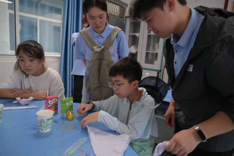 本次安徽理工大學志愿者扎染支教行動,既是非遺技藝向鄉(xiāng)村課堂的“創(chuàng)造性轉(zhuǎn)化”,亦是高校美育資源下沉的“創(chuàng)新性實踐”。以靛藍為媒介,志愿者將抽象文化基因轉(zhuǎn)化為可觸可感的少年記憶 ;以素布為畫板,孩童在捆扎浸染間印證“知行合一”的創(chuàng)造力量。志愿者將青年智慧注入非遺傳承——在折疊捆扎中解碼古老技藝,于浸染氧化間傳遞美育薪火。當非遺技藝通過“青年之手”扎根鄉(xiāng)村課堂,我們清晰看到:文化傳承的星火,正由 “志愿藍”與 “扎染青”共同編織,在鄉(xiāng)土大地上奔涌出“青春為證”的永續(xù)力量。