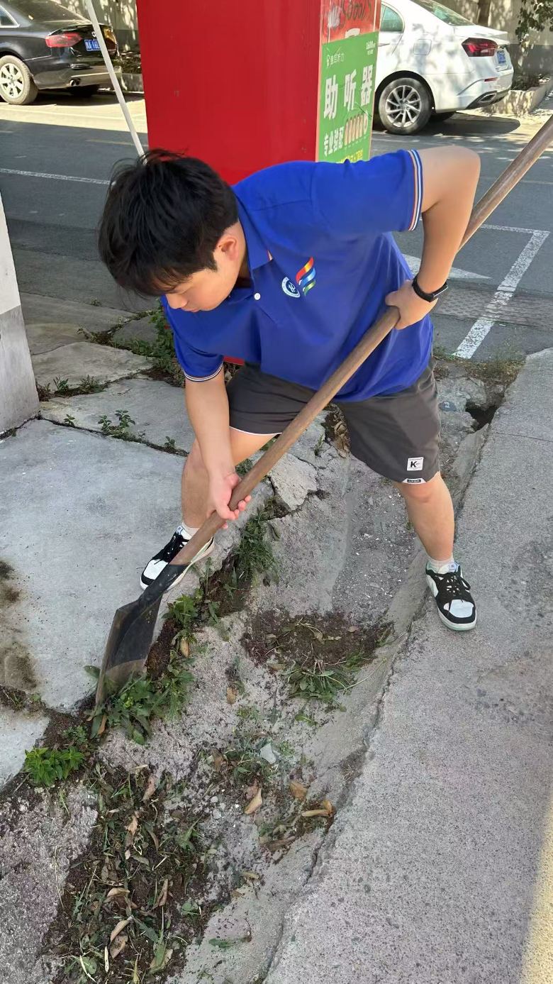 在除草過程中,實(shí)踐團(tuán)遇到不少難題。墻角、磚縫里的雜草根系深扎,難以拔除,成員們便蹲下身子,耐心用手配合工具一點(diǎn)點(diǎn)清理;部分區(qū)域雜草繁茂,大家相互配合,接力鏟除、搬運(yùn),高效推進(jìn)工作。