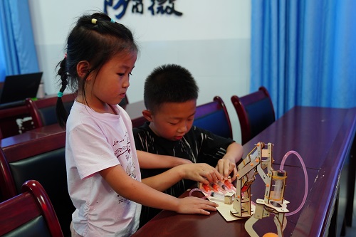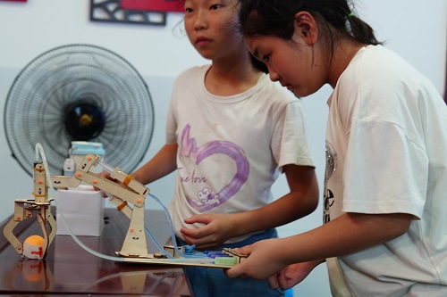在機(jī)械臂體驗(yàn)課上,志愿者講解齒輪傳動(dòng)與杠桿原理,并帶領(lǐng)孩子們使用吸管、橡皮筋等簡(jiǎn)易材料制作機(jī)械爪。通過(guò)“夾球挑戰(zhàn)”任務(wù),孩子們不斷調(diào)整,在實(shí)踐中理解摩擦力、力矩平衡等物理知識(shí),逐步形成“原理認(rèn)知—模型制作—優(yōu)化改進(jìn)”的工程思維過(guò)程。