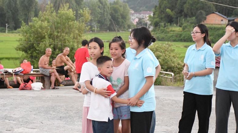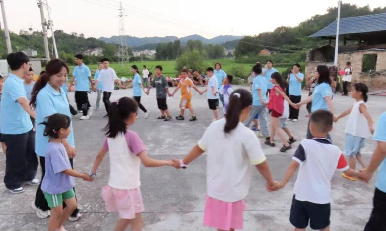 “桃花朵朵開”的游戲中,小朋友們和志愿服務(wù)小隊(duì)成員隨著口令手拉手圍成圈,按照口令開合變換隊(duì)形,山村中響起清脆的笑聲。
