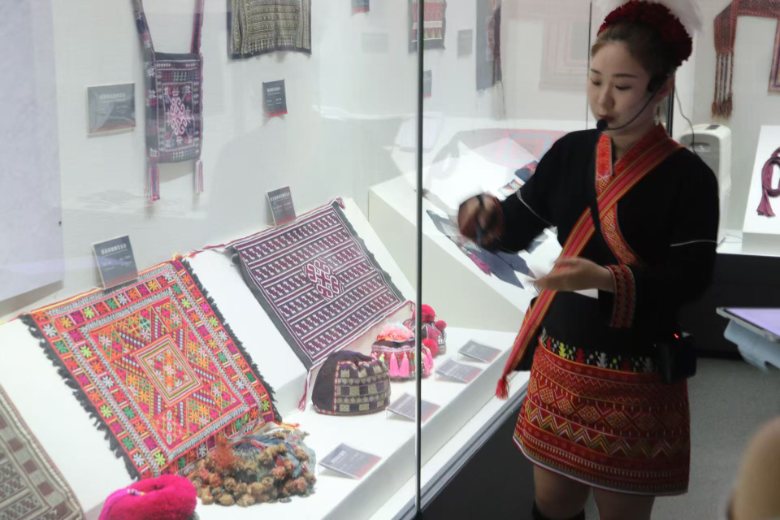 展區(qū)里,瑤族人口分布展示勾勒出民族遷徙融合軌跡,而瑤銀與瑤繡縫制的嬰兒帽,成為“文化明珠”。這些飽含祈福寓意的物件,制作精細(xì)至極:瑤銀飾件鏨刻精美圖案,瑤繡以細(xì)密針法勾勒多彩紋樣,凝結(jié)著瑤族婦女的技藝與對后代的期許,讓隊員們驚嘆于傳統(tǒng)工藝的精湛,感受文化傳承的溫度。