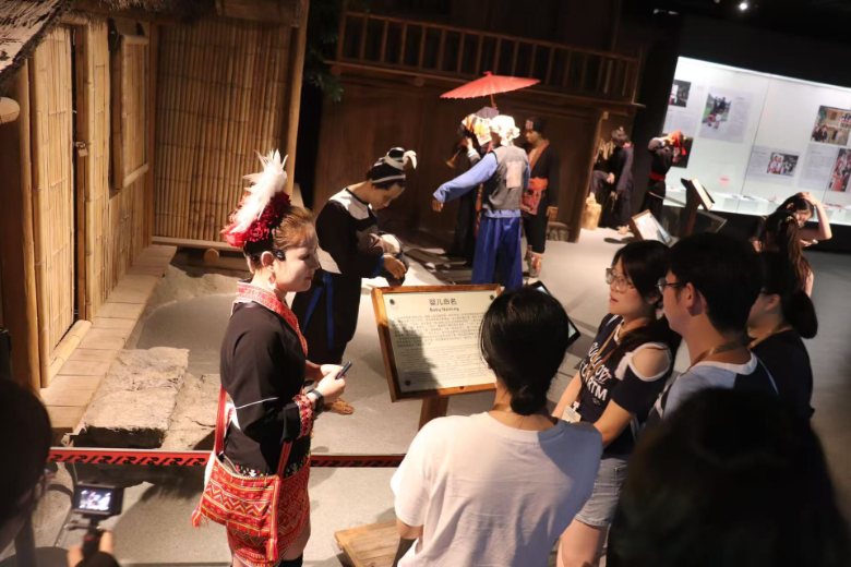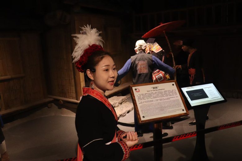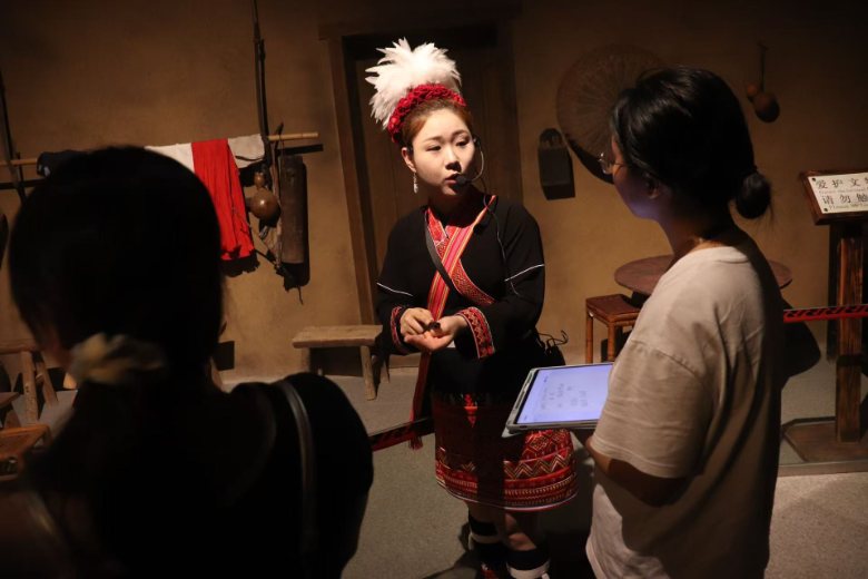 踏入博物館,正中央名為“龍犬”的標(biāo)志物率先抓住眾人目光。講解員介紹,龍犬是瑤族瑞獸,古時瑤族人民居住在深山之中,依靠狩獵維生,獵犬是他們不可或缺的伙伴,承載著瑤族對勇氣與生存的寄望。隊員們被這獨特文化符號震撼,直觀觸摸到瑤族與自然共生的歷史軌跡。