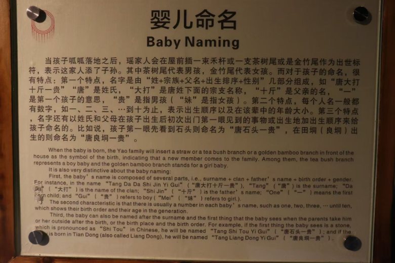 “嬰兒命名”展板,則揭開瑤族姓名文化奧秘。孩子出生后,他們的姓名由“姓+宗族+父名+出生排序+性別”(男子用貴,女子用妹)構(gòu)成,讓姓名成為家族譜系、文化記憶的載體,隊員們讀懂瑤族對后代、文化傳承的深深期許與鄭重厚望。