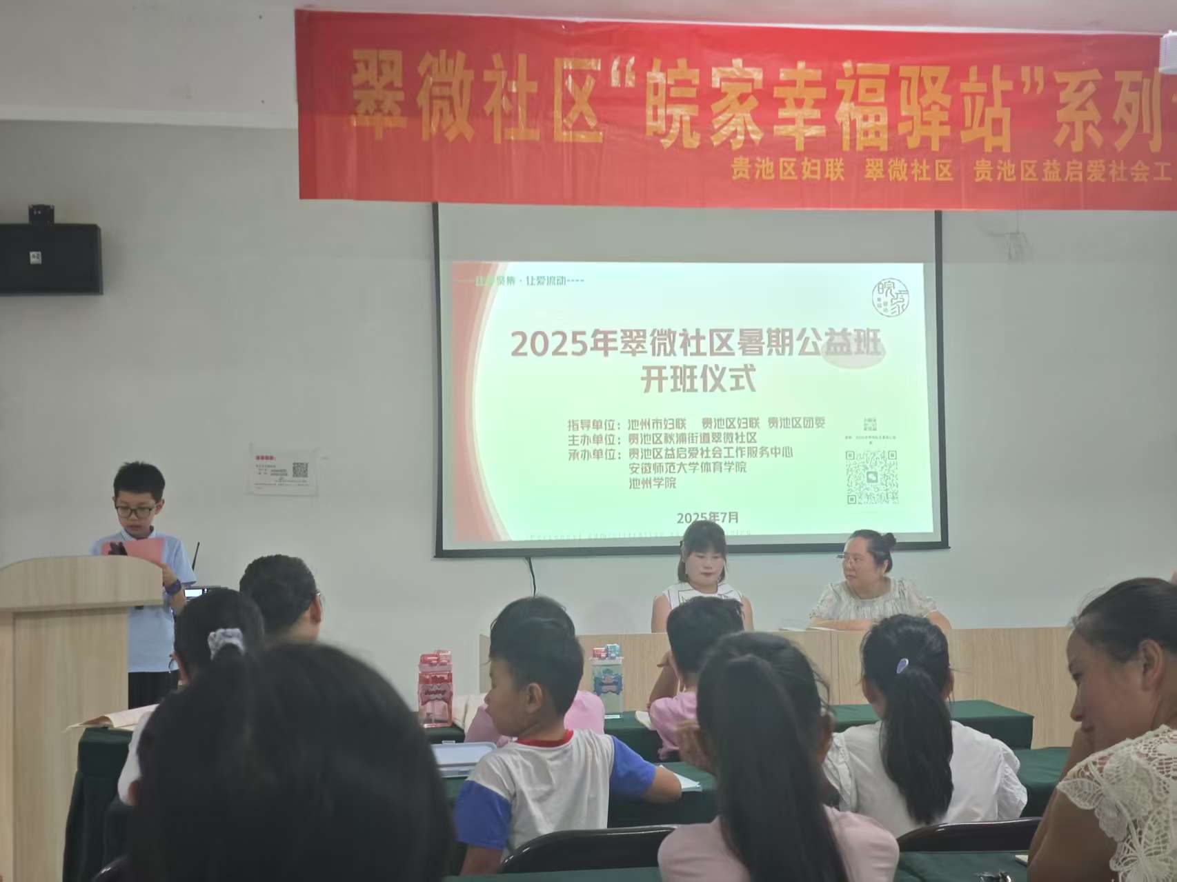 為助力社區(qū)發(fā)展,關(guān)愛(ài)兒童成長(zhǎng),2025年7月5日,翠微社區(qū) “皖家幸福驛站” 系列活動(dòng)暨大學(xué)生暑期三下鄉(xiāng)開(kāi)班儀式在社區(qū)活動(dòng)場(chǎng)地正式啟動(dòng)。此次活動(dòng)由翠微社區(qū)、貴池區(qū)益啟愛(ài)社會(huì)工作服務(wù)中心、赴池州市翠微社區(qū)志愿服務(wù)實(shí)踐團(tuán)聯(lián)合開(kāi)展,吸引眾多社區(qū)兒童及大學(xué)生志愿者參與。