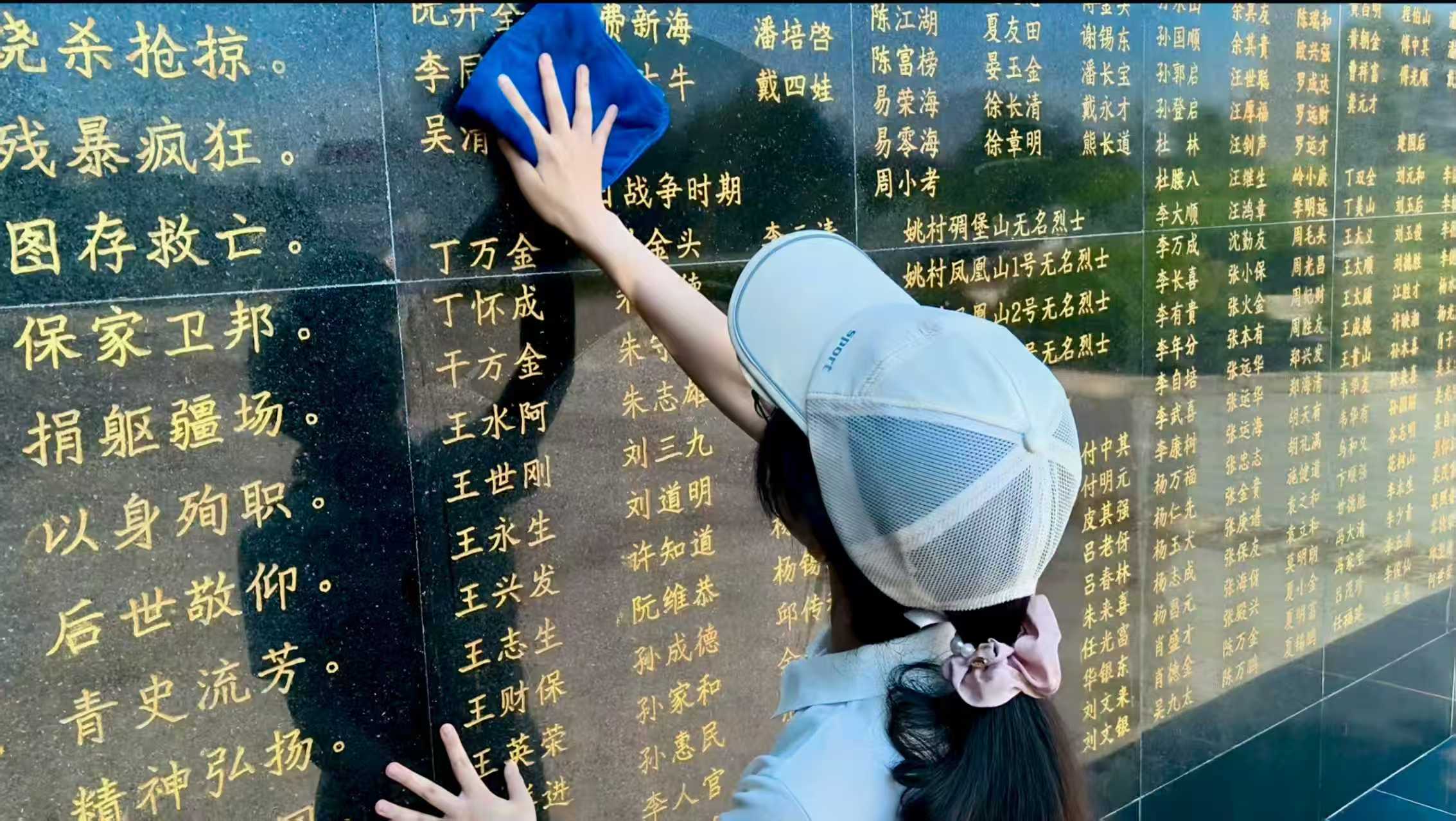 圖為團(tuán)隊(duì)成員擦拭英名墻