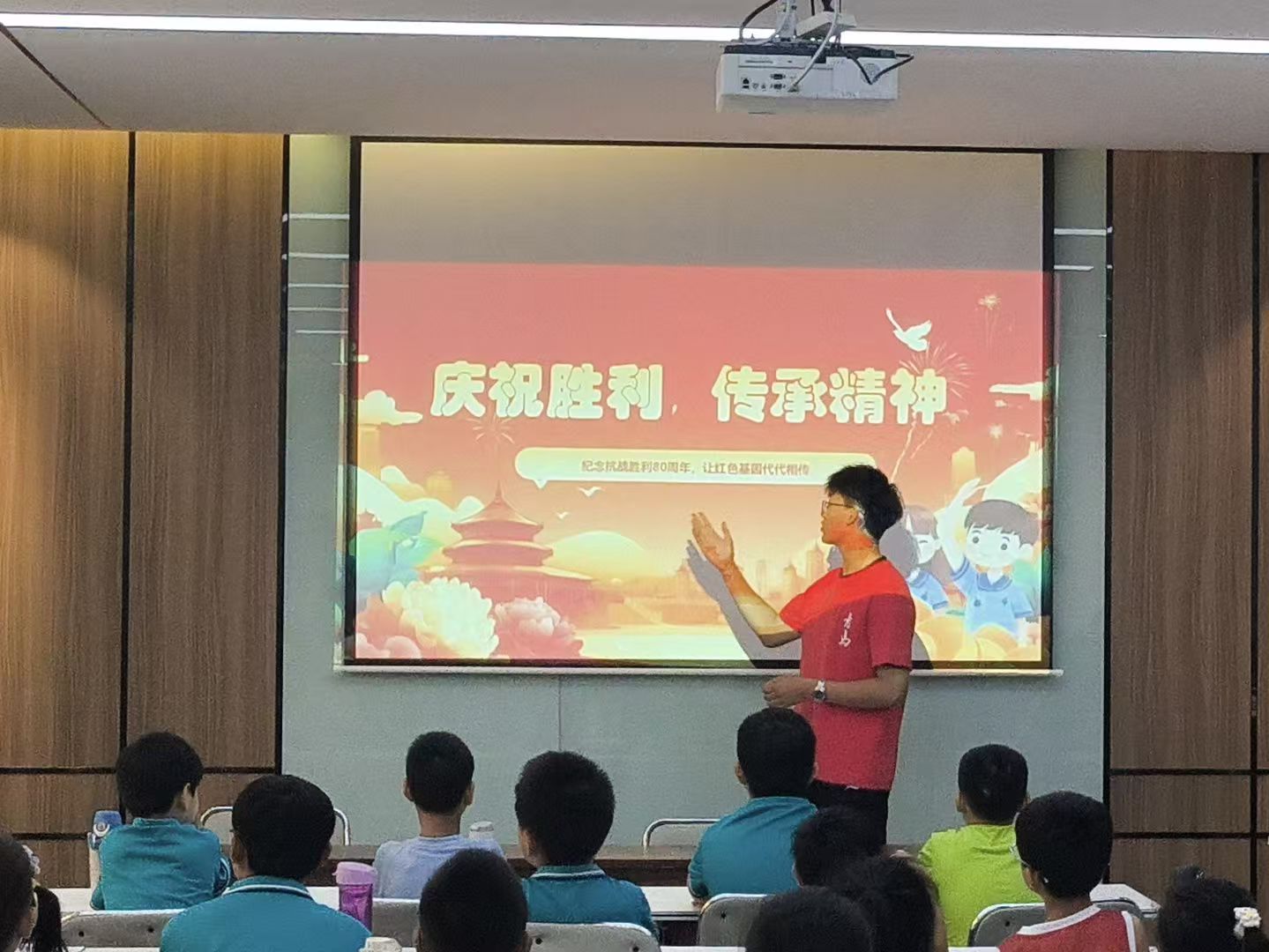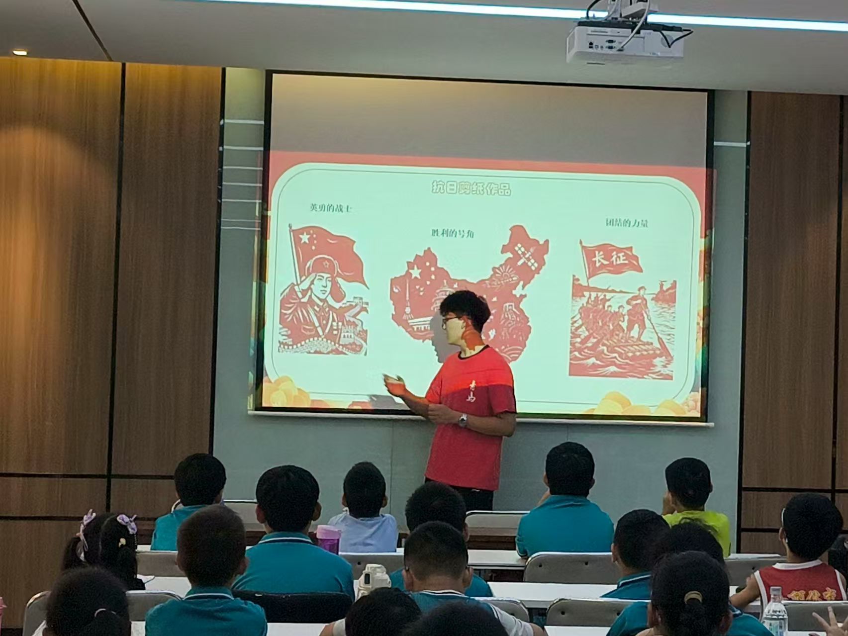 課堂上,實(shí)踐隊(duì)成員身著紅色隊(duì)服,圍繞“紀(jì)念抗戰(zhàn)勝利”主題,通過PPT展示、故事分享等形式,生動(dòng)講述抗戰(zhàn)歷史與英雄事跡。從抗日英雄的浴血奮戰(zhàn),到長征精神的代代傳承,隊(duì)員們用通俗易懂的語言,引導(dǎo)小學(xué)生們了解紅色歷史,感悟革命精神。