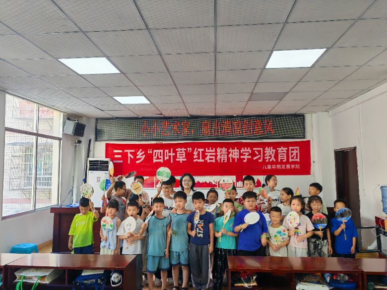 活動結(jié)合傳統(tǒng)團扇制作與現(xiàn)代美育,通過沉浸式體驗教學(xué),讓鄉(xiāng)村兒童體驗傳統(tǒng)文化。成員們向孩子們介紹團扇歷史與文化,并引導(dǎo)他們以"竹石精神"為主題進行創(chuàng)意繪畫,實現(xiàn)了傳統(tǒng)工藝與現(xiàn)代審美的融合;顒硬粌H讓傳統(tǒng)工藝在孩子們手中"活"了起來,還激發(fā)了他們的想象力和文化認同感,豐富了他們的課余生活,并在心中種下了文化自信的種"/>