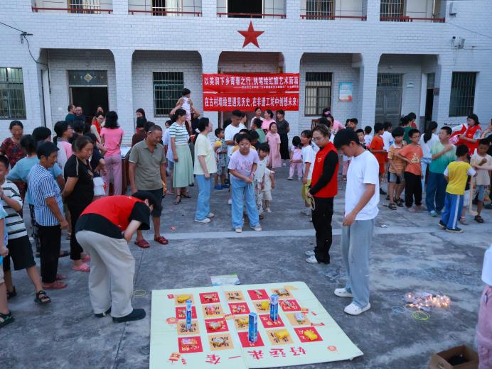 “藝術(shù)賦能紅色文旅振興”社會(huì)調(diào)研團(tuán)在墻繪前的合影 社區(qū)游園會(huì)是場(chǎng)意料之外的熱鬧。我們支起的攤位前,套圈的大叔和做非遺漆扇的阿姨爭(zhēng)著“排隊(duì)”,純真的小孩舉著發(fā)光波波球在人群里穿梭,把笑聲撞得四處飛濺。桌上冰壺成了“爆款”,起初是年輕人比輸贏(yíng),后來(lái)大爺們也加入戰(zhàn)局,輸了的被起哄著唱《東方紅》,贏(yíng)了的反倒把獎(jiǎng)品塞給旁邊的娃。看著大家攥著滿(mǎn)手的小禮品在夕陽(yáng)里道別,我們內(nèi)心充滿(mǎn)了成就感。尤其是看到一些原本陌生的村民,通過(guò)游戲互動(dòng)變得熟絡(luò)起來(lái),我更加明白,一場(chǎng)小小的游園會(huì),不僅能給人們帶來(lái)快樂(lè),還能增進(jìn)人與人之間的感情,凝聚社區(qū)的力量。