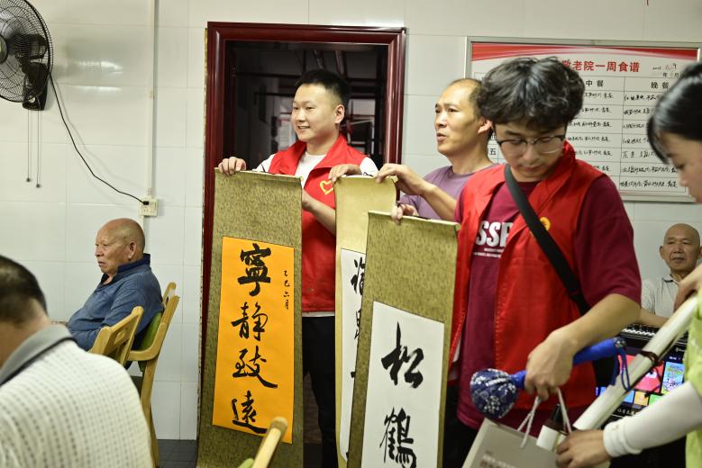 實(shí)踐團(tuán)成員為老人們講解艾草錘制作過程并協(xié)助制作 活動最后,實(shí)踐團(tuán)為敬老院送上了精心書寫的書法作品。一幅幅作品字跡遒勁、墨香四溢,“寧靜致遠(yuǎn)”“松鶴齡” 等內(nèi)容飽含著對老人的美好祝福。老人們接過作品,臉上洋溢著幸福的笑容。