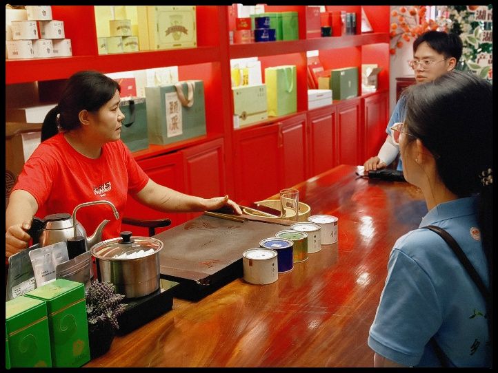 古丈茶業(yè)有限公司的茶文化體驗(yàn)店。該店集產(chǎn)品展示、品鑒銷(xiāo)售與文化宣傳于一體,店內(nèi)陳設(shè)古樸典雅,茶藝設(shè)施齊全。工作人員向團(tuán)隊(duì)詳細(xì)介紹了古丈茶文化歷史、制茶工藝及當(dāng)?shù)?ldquo;茶王”賽事等特色活動(dòng),生動(dòng)展現(xiàn)了“茶旅融合”的獨(dú)特魅力。“我們希望通過(guò)茶室讓游客不僅買(mǎi)到好茶,更能體驗(yàn)古丈的茶文化底蘊(yùn)。”店員表示。這種“沉浸式”營(yíng)銷(xiāo)模式,正成為古丈茶產(chǎn)業(yè)突破傳統(tǒng)銷(xiāo)售邊界的新嘗試。