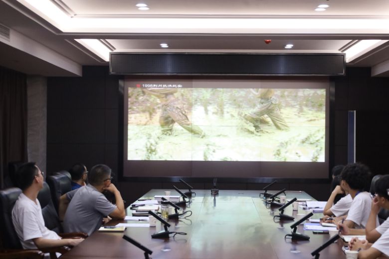 圖為團(tuán)隊(duì)成員與專(zhuān)家團(tuán)隊(duì)觀看抗洪紀(jì)錄片楊思航攝