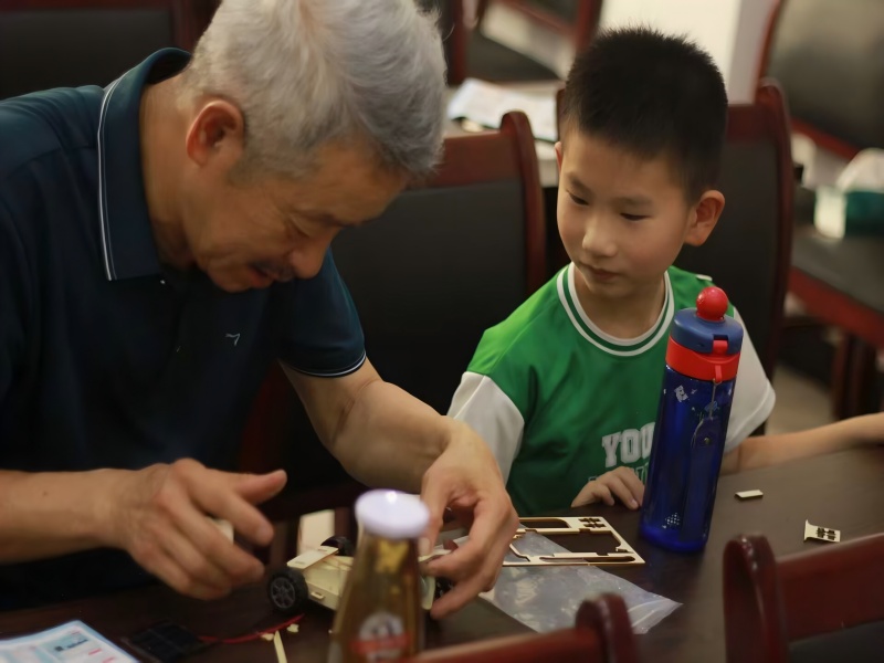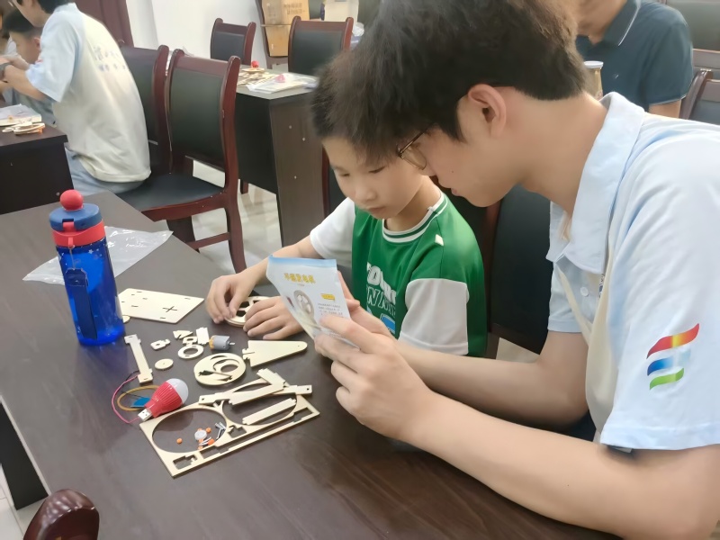 在課程體驗(yàn)環(huán)節(jié),“淮繪星光”志愿服務(wù)團(tuán)成員張琨帶來(lái)了“太陽(yáng)能小車——探索光與動(dòng)力的奧秘”理論與實(shí)踐課程。課程中,張琨通過(guò)生動(dòng)有趣的講解,帶領(lǐng)孩子們深入了解電能、太陽(yáng)能等理論知識(shí),從能源的基本概念,到電能與太陽(yáng)能的產(chǎn)生原理、應(yīng)用領(lǐng)域等,讓孩子們對(duì)能源科學(xué)有了初步認(rèn)識(shí)。實(shí)踐課上,孩子們?cè)趶堢闹笇?dǎo)下親手制作手搖發(fā)電機(jī)與太陽(yáng)能小車,將理論知識(shí)轉(zhuǎn)化為趣味實(shí)踐。他們認(rèn)真地組裝零件、連接線路,在動(dòng)手過(guò)程中探索光與動(dòng)力的奧秘,現(xiàn)場(chǎng)氣氛熱烈,激發(fā)了孩子們對(duì)科學(xué)的探索熱情。