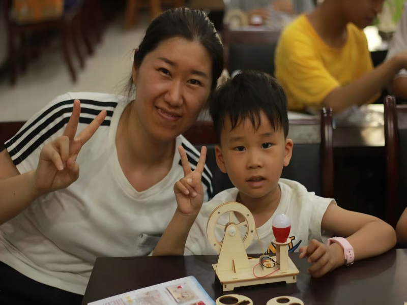(圖為家長(zhǎng)成功協(xié)助孩子完成手搖發(fā)電車,肖嘉華攝)
