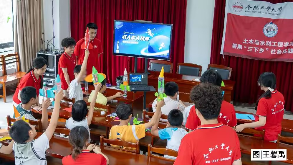 2025年7月8日下午,合肥工業(yè)大學(xué)“砼筑華彩,鄉(xiāng)伴成長”隊伍的10名志愿者開展了紅色主題的志愿活動,向福利院十名兒童傳播了航天知識,并帶領(lǐng)兒童手工制作了火箭模型。