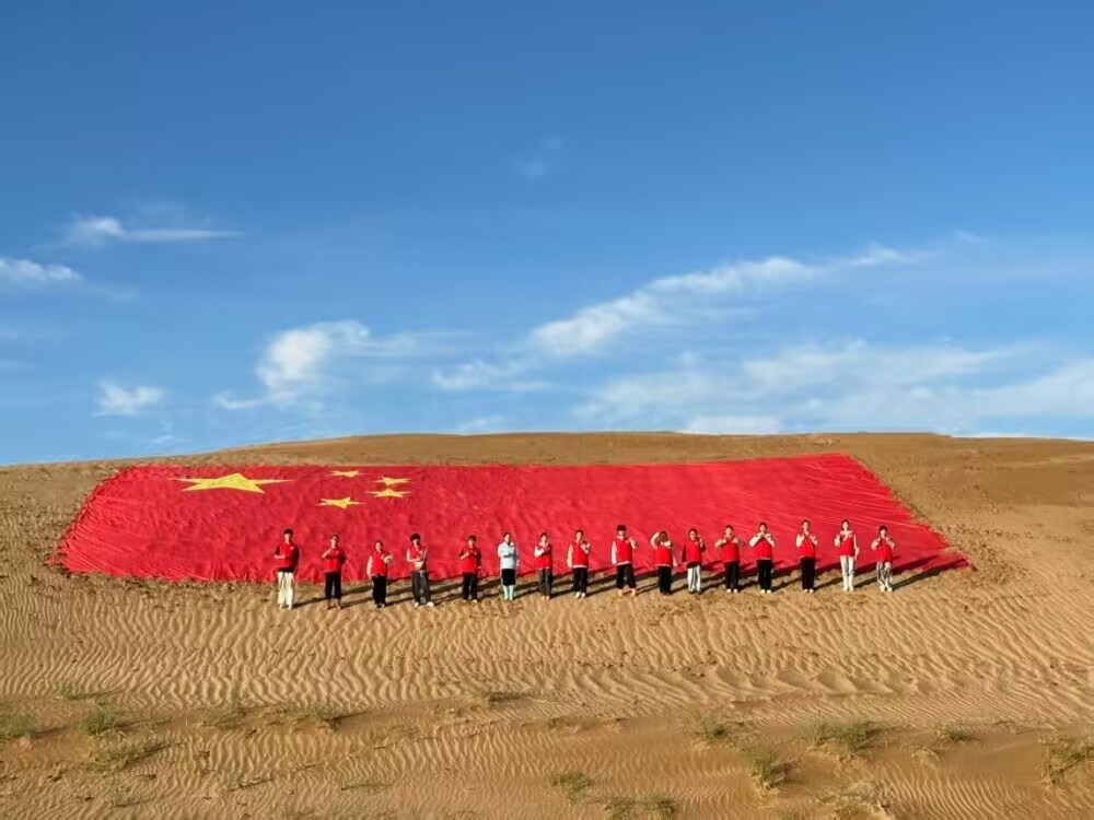 蒼茫大漠深處,漠峰之上,獵獵勁風(fēng)裹挾著細(xì)沙,在星穹之下呼嘯奔騰。此刻,一面巨幅國旗正被志愿者們奮力展開。