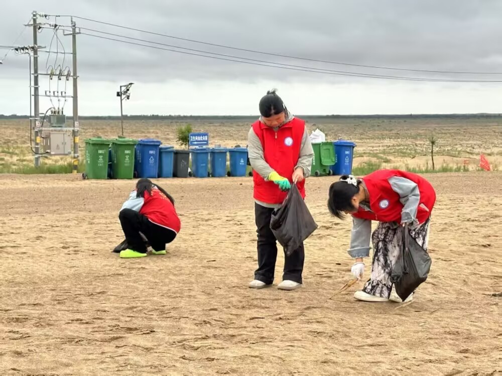 實(shí)踐團(tuán)成員的身影,是基地清晨最躍動的色彩。他們手持工具,細(xì)致清理散落在梭梭林間、草方格沙障和基地周邊的塑料瓶、廢棄包裝等外來物。每一次彎腰俯拾,都是對脆弱生態(tài)的鄭重守護(hù)。沙粒鉆進(jìn)鞋襪,汗水浸透衣背,年輕的臉龐在陽光下閃耀著堅(jiān)毅的光芒。沙海無言,但被細(xì)心規(guī)整后的基地,以更潔凈、更富生機(jī)的姿態(tài),回應(yīng)著青春的付出。陽光逐漸升高,汗水浸濕了衣衫,卻絲毫沒有減退大家的干勁——每清理一片區(qū)域,就像為這片脆弱的土地拂去一層塵埃。