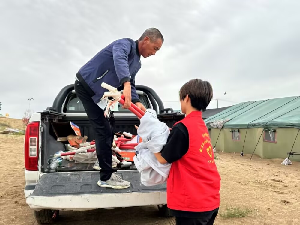 在基地工作人員指引下,隊(duì)員們迅速投入工作。一摞摞棉被被小心傳遞安放,似在傳遞守護(hù)安眠的暖意;一張張木桌在默契協(xié)作中穩(wěn)穩(wěn)立起,為治沙前線運(yùn)轉(zhuǎn)鋪就基底;其余物資也在青年們肩扛手提的接力下,有序抵達(dá)指定位置。汗珠滑落浸濕衣衫,卻無人停歇,每一次彎腰托舉、接力傳遞,都凝結(jié)著對這片土地深沉的關(guān)切。