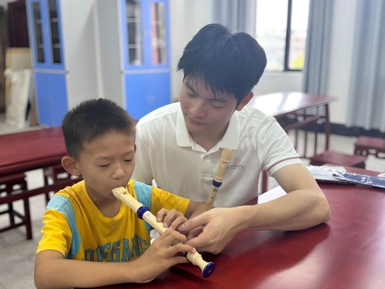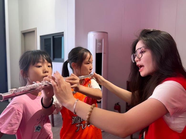 圖為志愿者教小朋友長笛。 張曦文通訊員攝