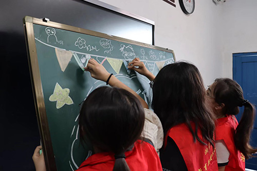 (圖為實(shí)踐團(tuán)隊(duì)繪制夏令營各班級(jí)歡迎板報(bào))