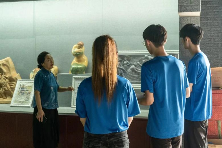 圖為界首彩陶傳承人邢淑芹老師在向團(tuán)隊(duì)成員介紹王京勝和閆玉敏二位大師的代表作。田澤坤 攝