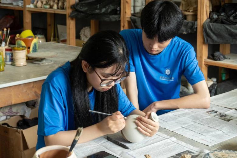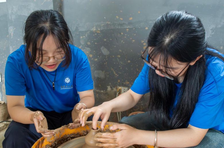 圖為團(tuán)隊(duì)成員在親自體驗(yàn)界首彩陶的制作過(guò)程,并將“薪火計(jì)劃”會(huì)徽進(jìn)行設(shè)計(jì)刻制于彩陶之上。田澤坤 攝