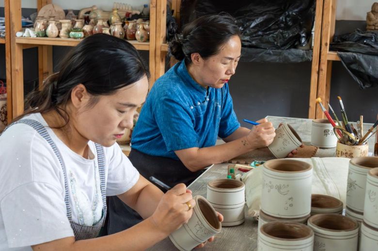 圖為邢淑芹老師和她的弟子向團(tuán)隊(duì)成員展示彩陶刻畫(huà)技術(shù)。田澤坤 攝