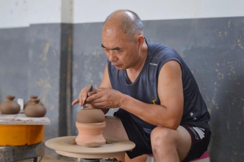 圖為調(diào)研團(tuán)成員觀摩彩陶手藝人制作陶器過(guò)程。田澤坤 攝