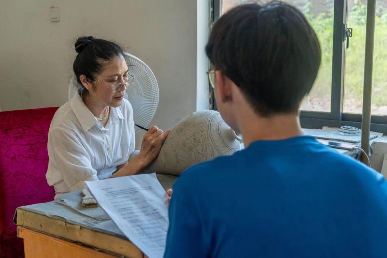 圖為團(tuán)隊(duì)成員在盧莉華老師的講解下對(duì)她的作品進(jìn)行觀摩學(xué)習(xí)。李心妍 攝
