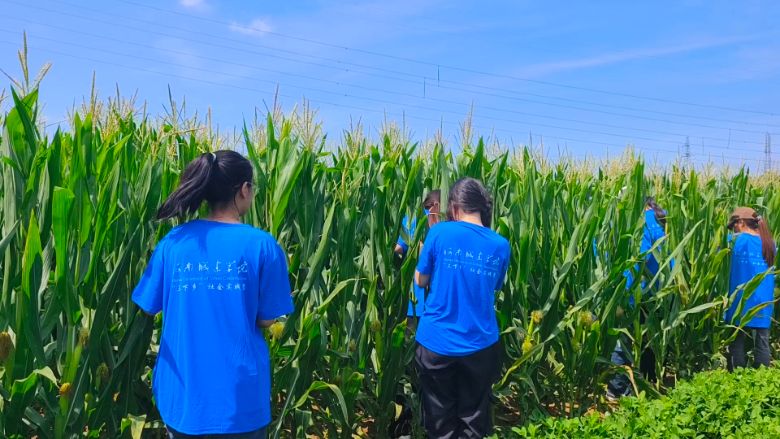 轉(zhuǎn)過身來,是一片玉米地,同學(xué)們穿梭于玉米秸稈間,觀察玉米須是否干枯,玉米棒外是否變黃,捏一捏玉米粒,飽滿堅硬就代表成熟了。一手握住玉米棒下方的秸稈,一手抓住玉米棒,用力向下掰,“咔嚓”一聲就能摘下來。
