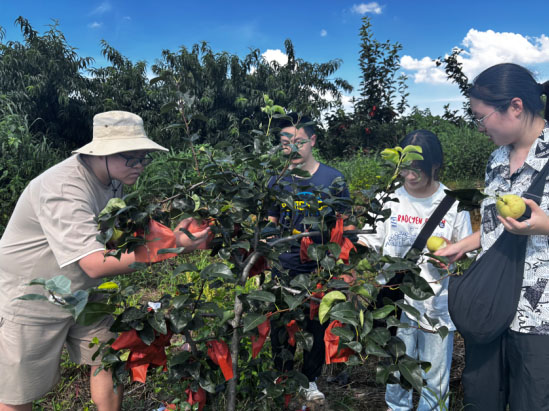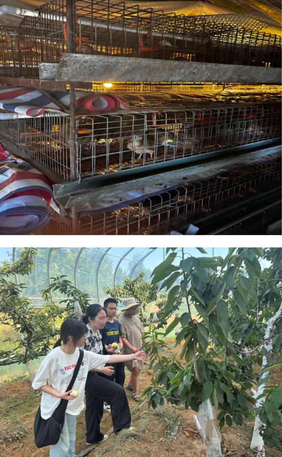 多元實踐拓展: 實踐周內(nèi),團隊足跡遍布農(nóng)場多元業(yè)態(tài)。我們進(jìn)入桃子梨子等水果種植區(qū),學(xué)生們學(xué)習(xí)水果栽培管理要點,品嘗了甜美可口的梨子;幼雞雞舍中,關(guān)注不同生長階段的精細(xì)化照料;鴨舍的探訪則豐富了大家對農(nóng)場生態(tài)循環(huán)與多元化經(jīng)營的認(rèn)知,我們站在烈日下,看著波光粼粼的水面上鴨子們歡聲笑語。每一次觀察與交流,都在拓寬著學(xué)子們對現(xiàn)代農(nóng)業(yè)立體圖景的理解。