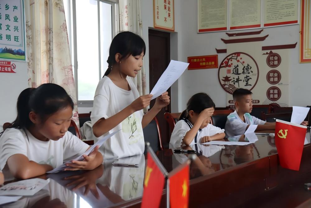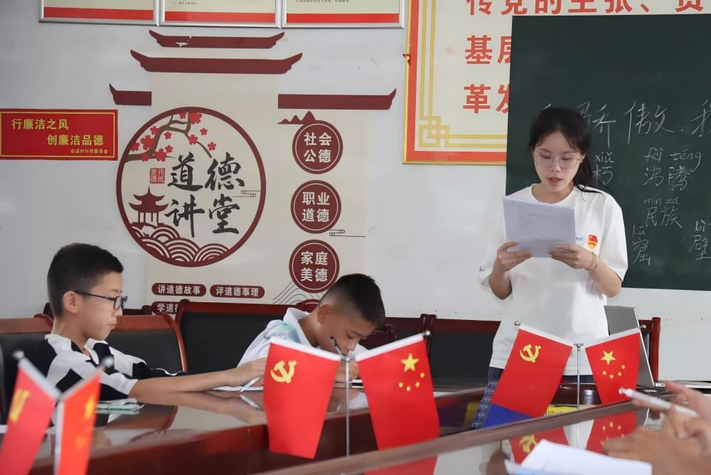 (通訊員:龔金鳳)7月9日下午,湘西會溪村的居委會傳來陣陣清脆激昂的朗誦聲。湖南第一師范學院“惠溪知行”鄉(xiāng)村振興促進團的志愿者們走進這里,為當?shù)匦∨笥褌儙砹艘惶弥黝}為“我驕傲,我是中國人”的口語朗誦課,讓紅色情懷在朗朗書聲中悄然傳遞。